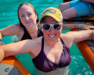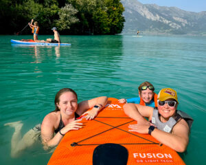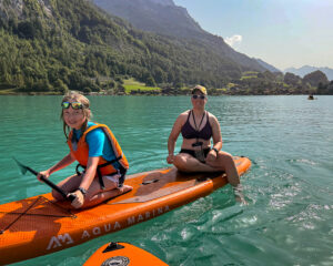 After that, we walked to Iseltwald, where we swam for a little while inĀ Lake Brienz, but it was super-duper cold near the shore, so we rented two paddleboards and paddled out to a private island that we couldn’t go on. We circled around the island and saw that it had a church and a viewpoint. We hopped off the paddleboards and swam in the water, which was less cold further away from shore. I loved swimming in the clear water, with the mountains all around us.